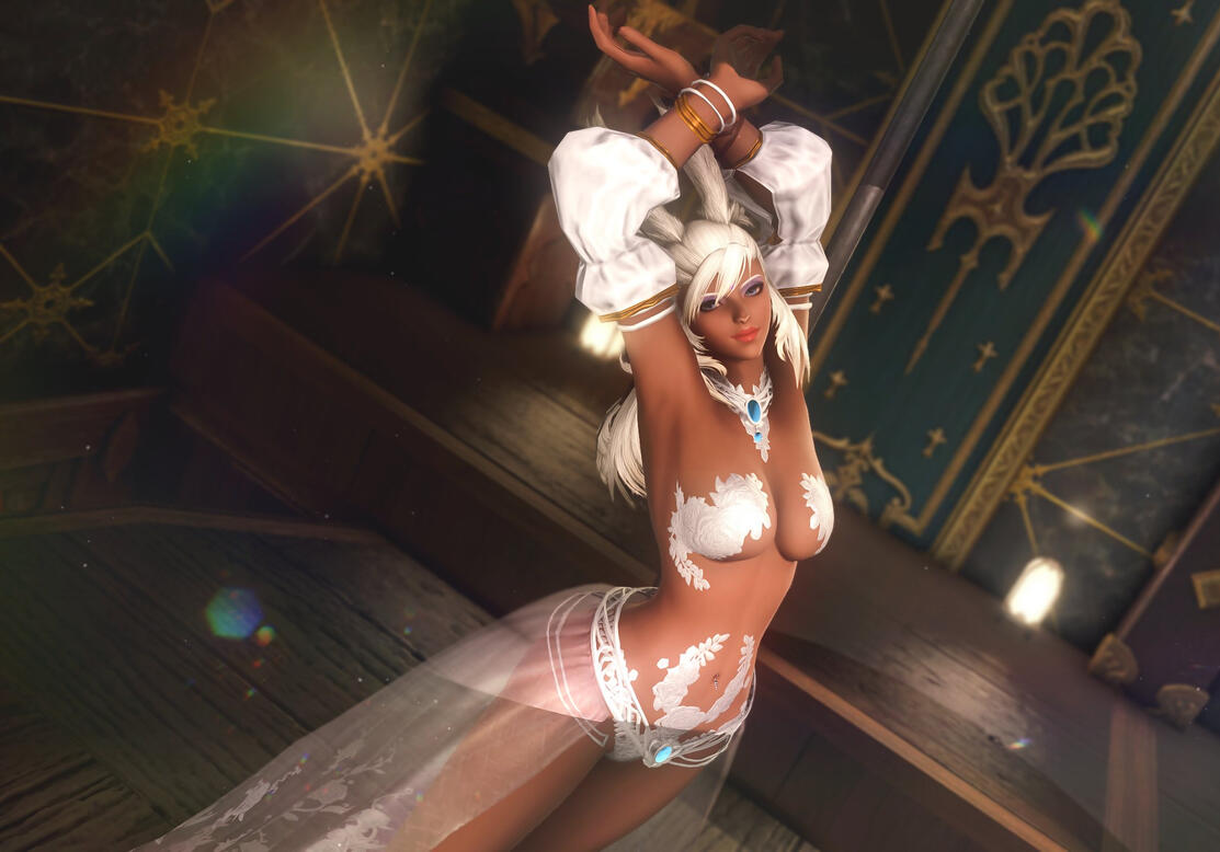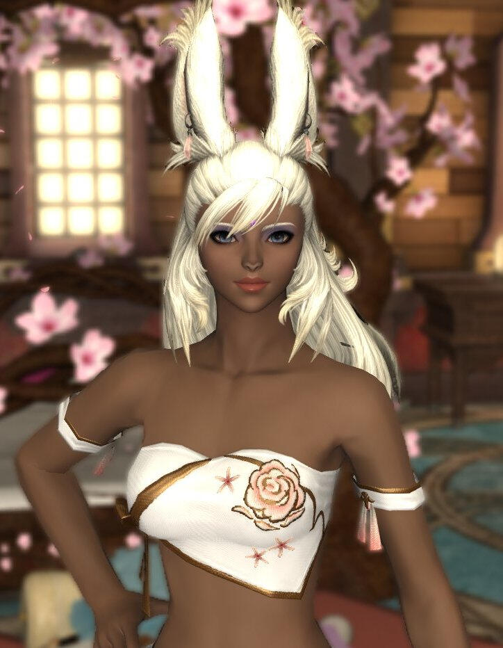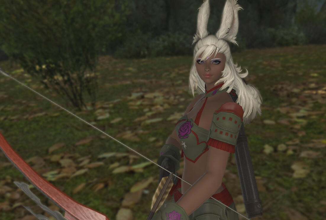 Note: much of the below would not be casually known to someone who meets Celia.Celia was born in Dalmasca, in a Rava village in the middle of the Golmore Jungle. As a young child, she was tall for her age, which made her awkward and self-conscious -- traits which she did not entirely overcome until adulthood.As with all children in her village, she was raised communally by the adult Rava, and trained as a hunter and soldier, becoming an expert with the bow and the spear. She also learned about the flora and fauna of their jungle, and developed a talent for tending the village's crops.When Celia became an adult, at age 17, she was taken as a wife by one of the village leaders. She joined her wife's household, where she was the youngest of five "sister wives." She lived with her fellow wives for twelve years, both tending to household duties, as well as serving with her sister Rava as a warrior, defending their village against regular incursions by the Garlean army.In time, Celia grew restless, and a sense of wanderlust, and a desire to see the world, grew in her. She eventually asked for an end to her role as a wife, and declared her intent to leave her village -- an act which violated the Rava "Green Word," which required her family and friends to shun her for departing, and meant that she would likely not ever be welcomed back to her home.Celia's travels first took her west, to Eorzea. She visited each of the major nations there, and spent most of a year in the Twelveswood, before returning east, and traveling through Doma, then Kugane.While she was in Kugane, a friend brought her to a nightclub, The Dragon's Den -- Celia quickly became a regular there, and befriended several members of the staff. She began to study dance with one of the Den's dancers, and became a member of the club's staff soon after.She now splits her time between Kugane, and the home she shares with her partner in Ul'dah.RelationshipsSince leaving Golmore, Celia has made a number of friends. She has had several different romantic partners during her travels; she is currently in a relationship with a partner, to whom she is deeply committed.